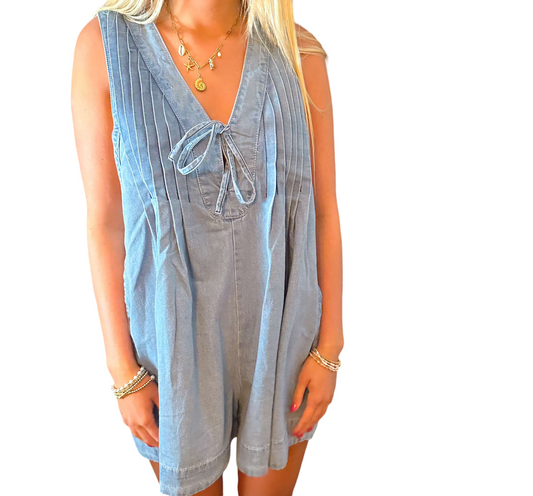 Denim Delight: Pleated V-Neck Sleeveless Romper