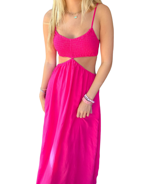 Natalie Hot Pink Cut-Out Maxi Dress with Smocked Sleeves