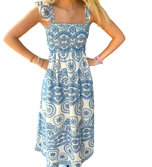 Kaitlyn's Elegant Tie-Shoulder Smocked Midi Dress
