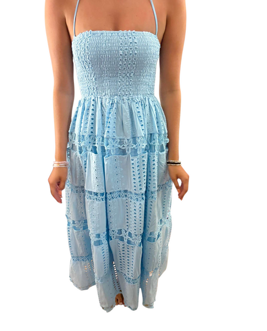 Gracie's Whimsical Elegance: Backless Blue Embroidered Maxi Dress