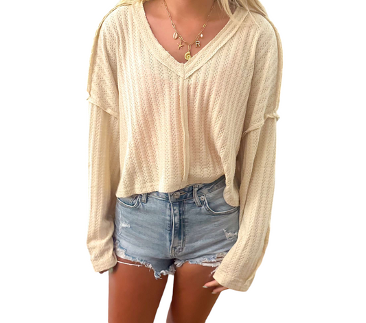 Darcy: Chic White V-Neck Sweater with Bubble Sleeves