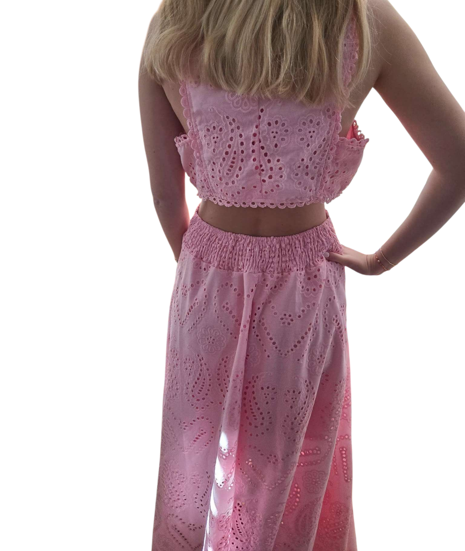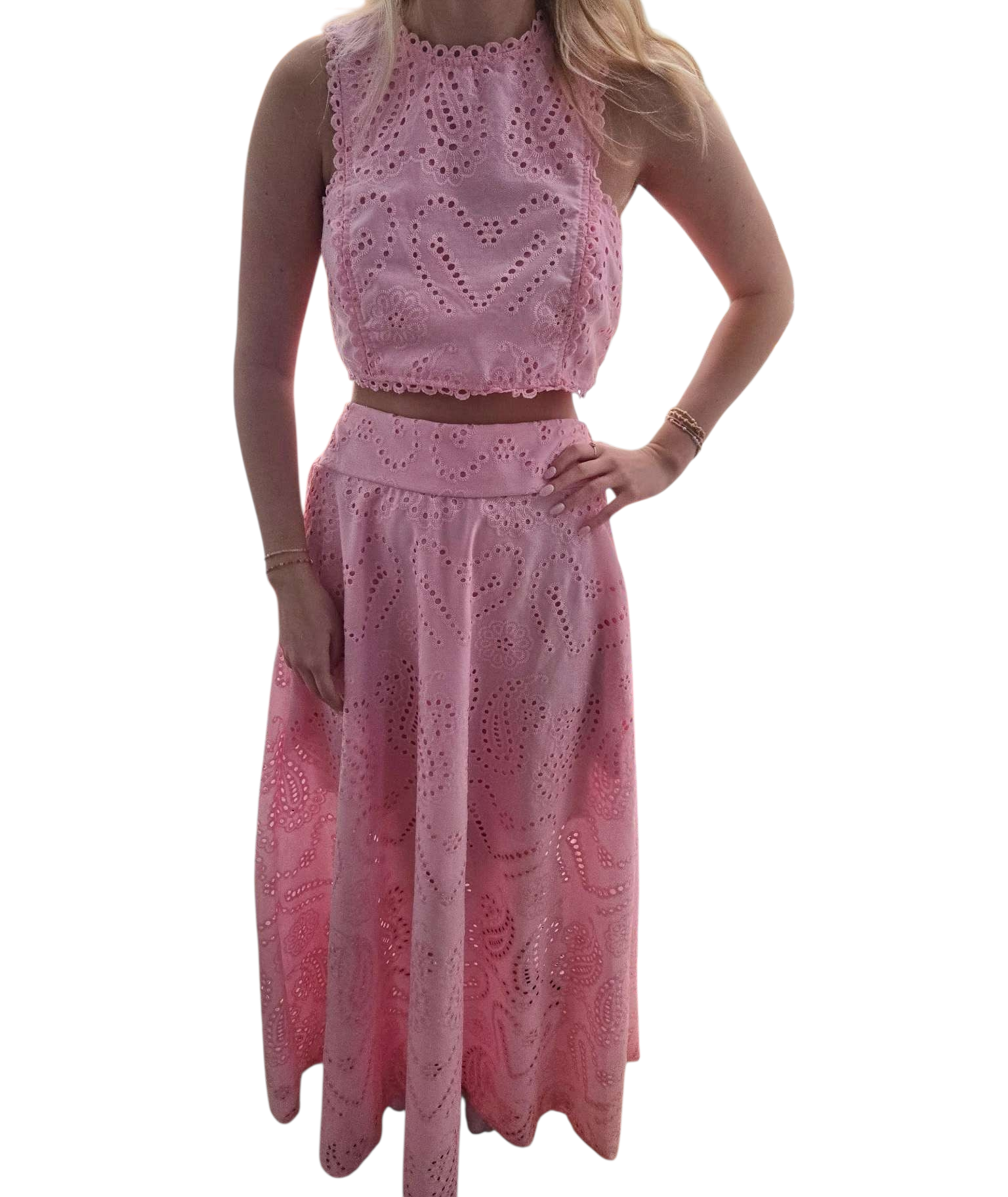 Meet the Alexandria set in Pink — the sweetest two-piece moment you need in your closet! This soft pink eyelet set features a high-neck crop top with scalloped edges and matching flowy midi skirt, all decked out in the dreamiest heart + paisley eyelet pattern. It’s flirty, feminine, and oh-so-preppy!