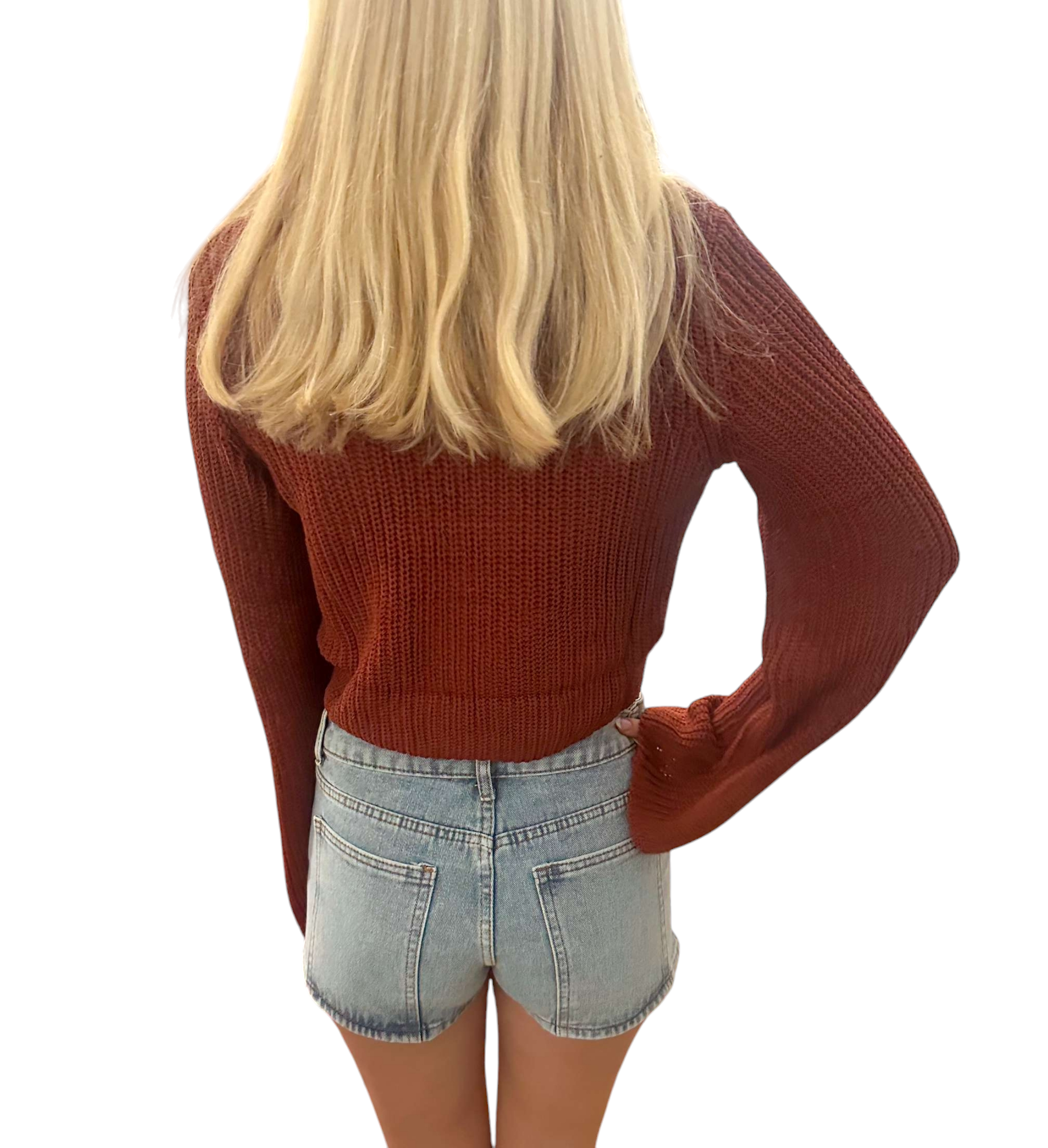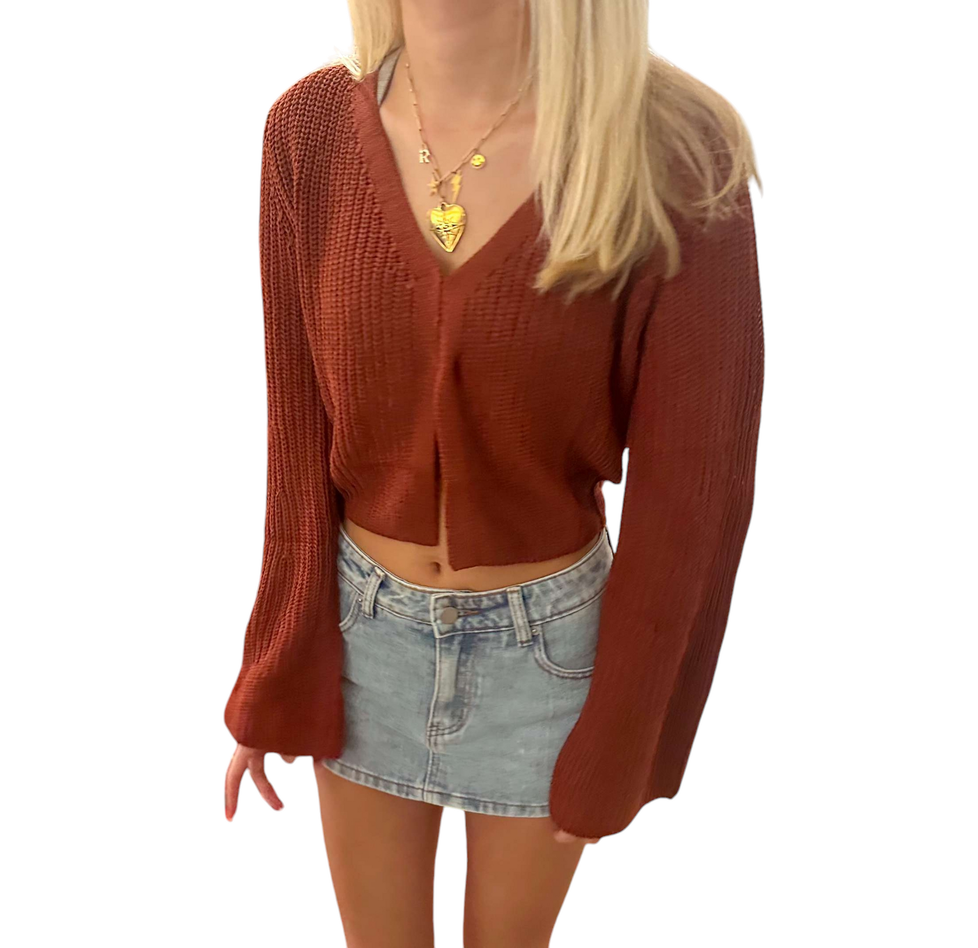 Long bell sleeve v neck cardigan sweater in Rust. Perfect for fall and Thanksgiving.