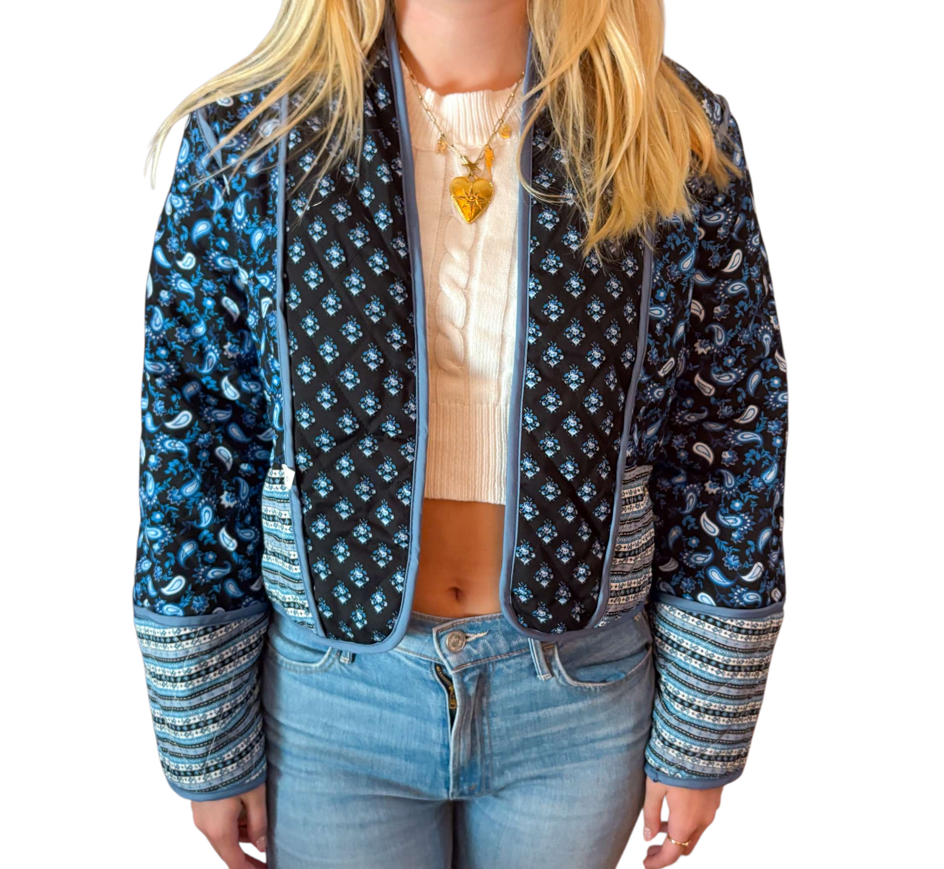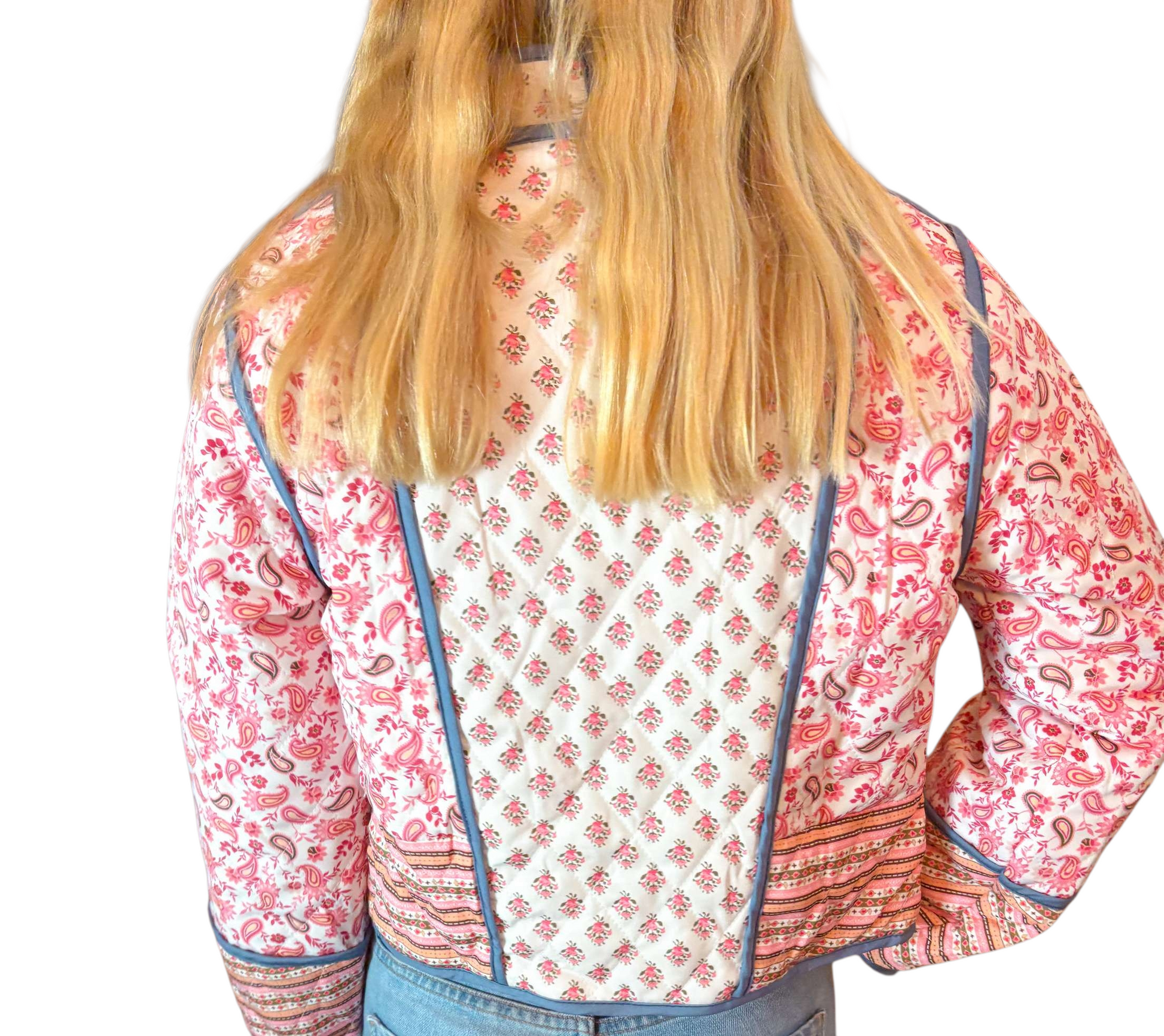 Cropped quilted floral print puffer jacket. Reversible can be worn pink or blue.