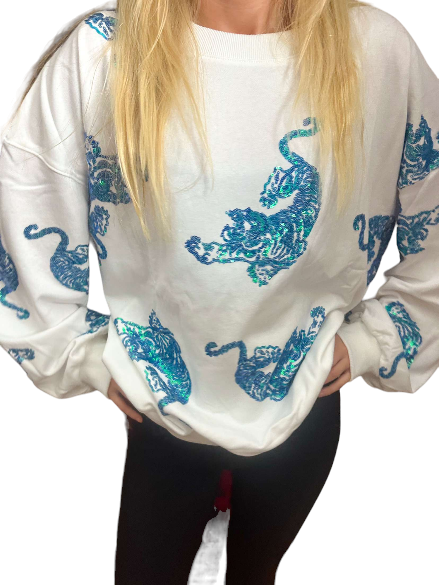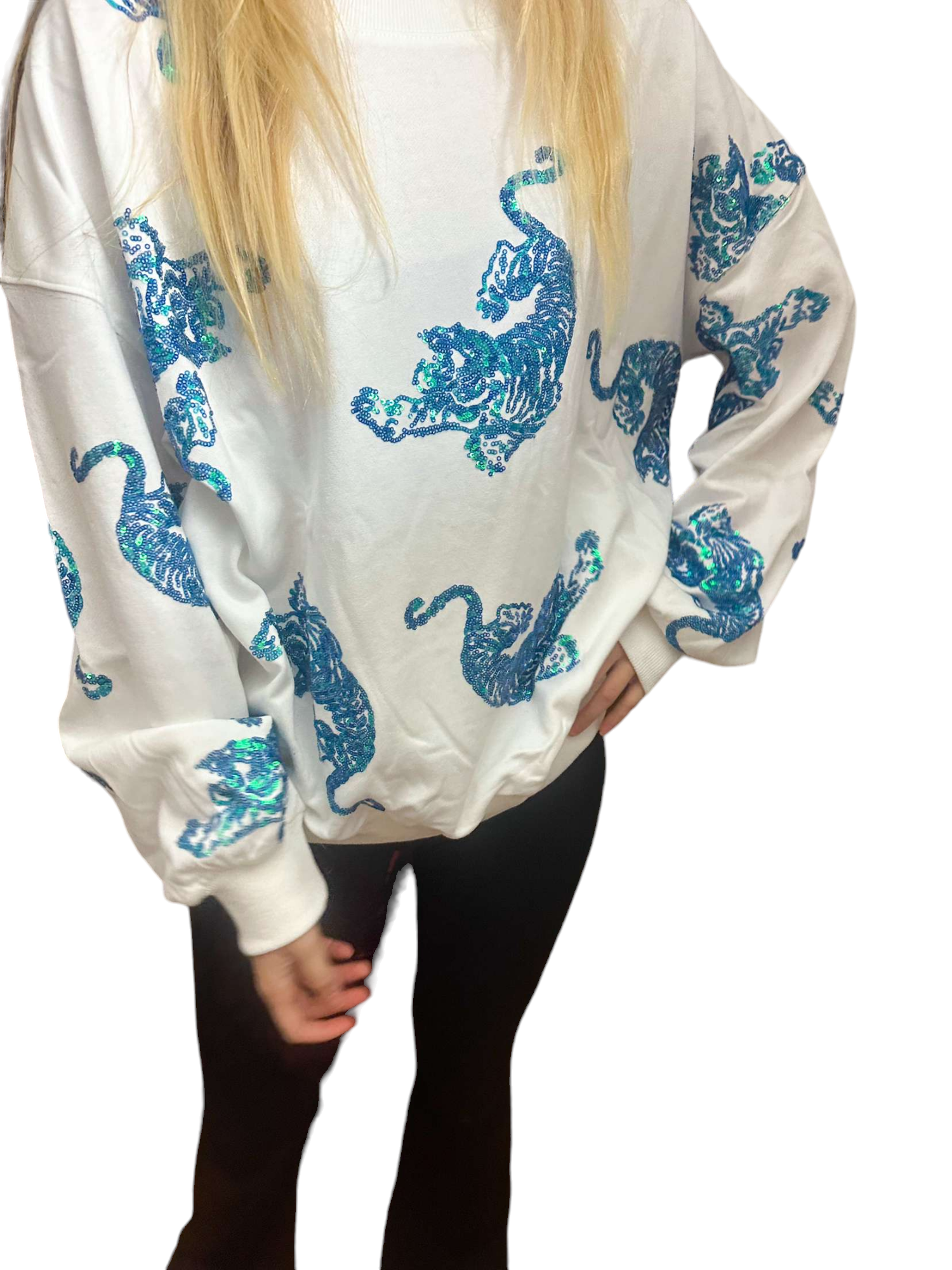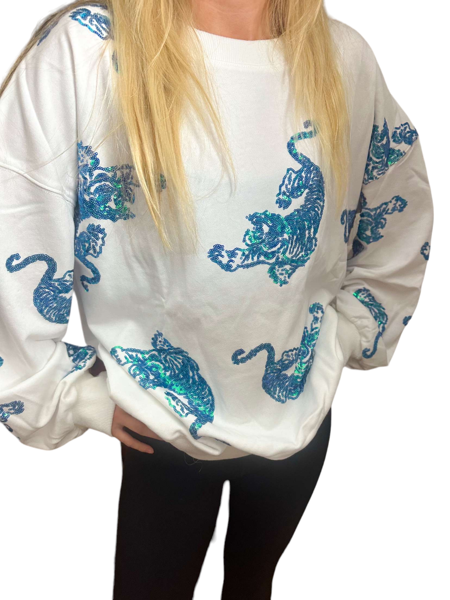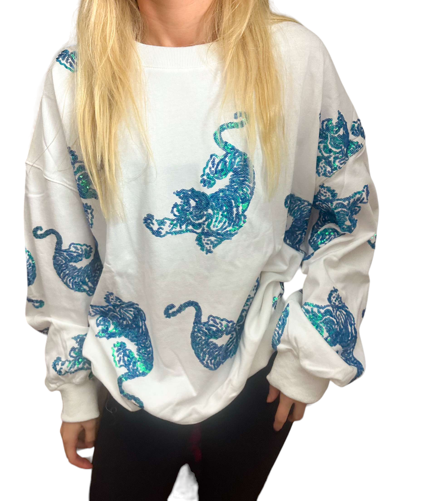 Unleash your wild side with the Beverly Tiger Sweater, a unique blend of comfort and style. This eye-catching white sweatshirt features stunning blue and teal sequined tigers, making it a standout piece in any wardrobe.