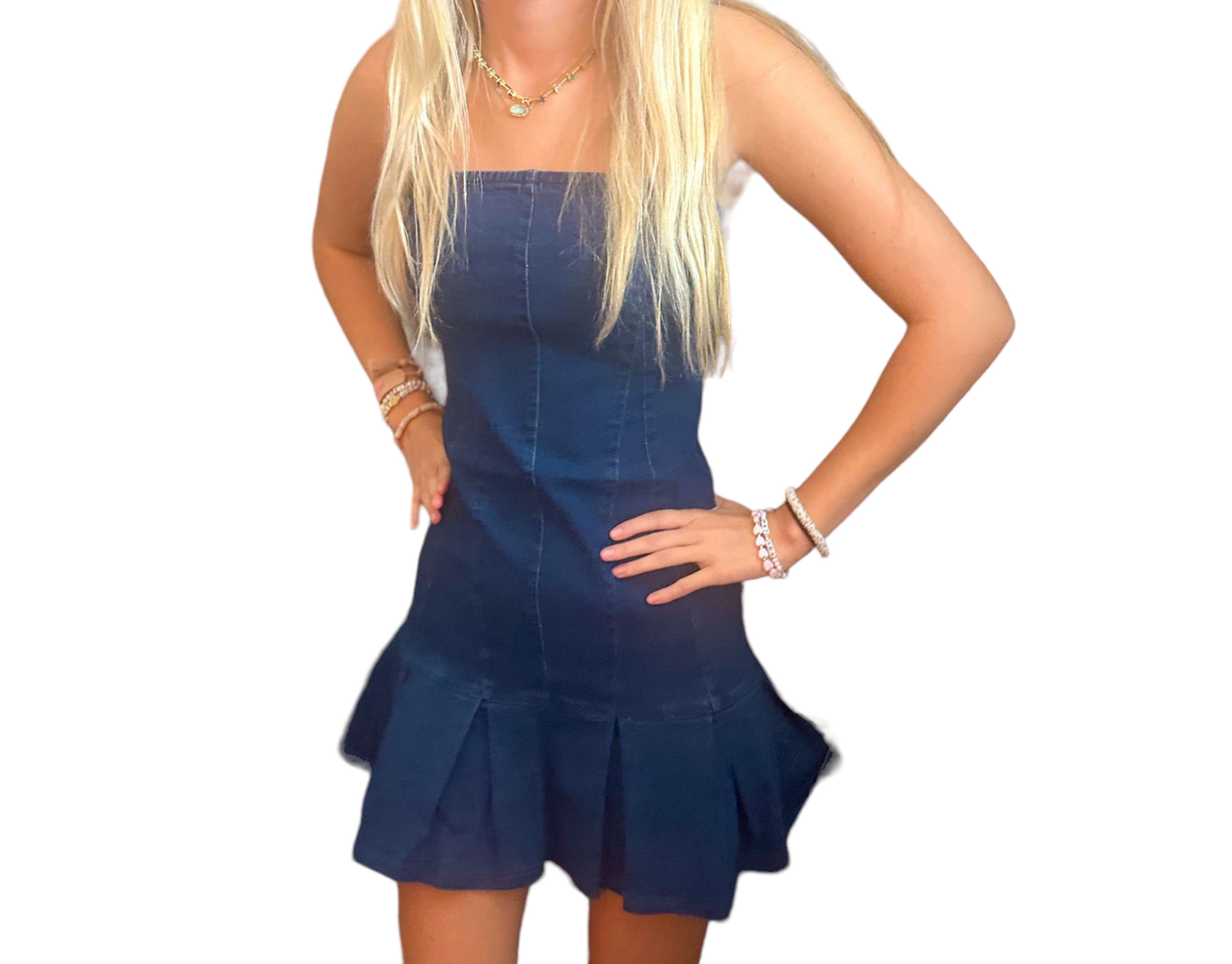Elevate your wardrobe with the stunning Gianna Dress, a perfect blend of style and comfort. This strapless denim mini dress features an eye-catching pleated design, making it the ideal choice for any occasion.