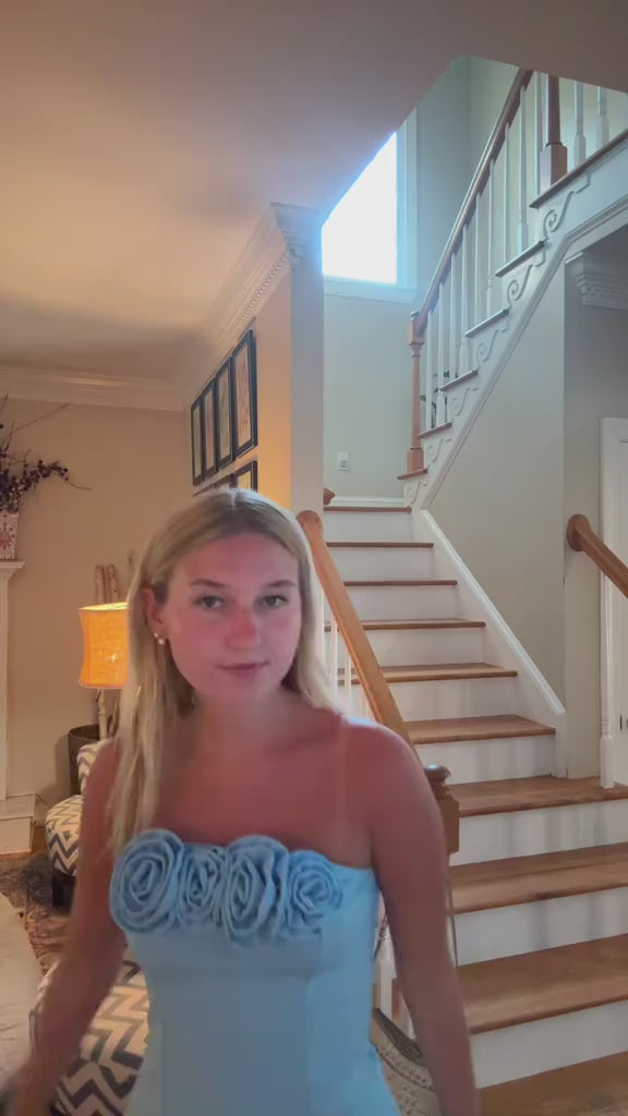 Strapless blue mini dress with 3d flowers. Perfect for homecoming or any special occasion!