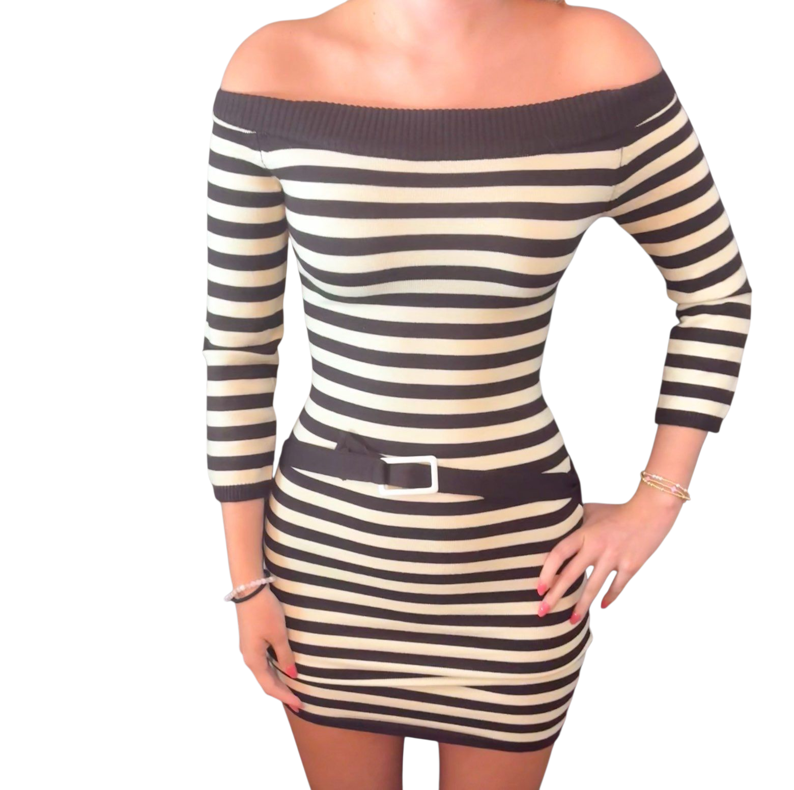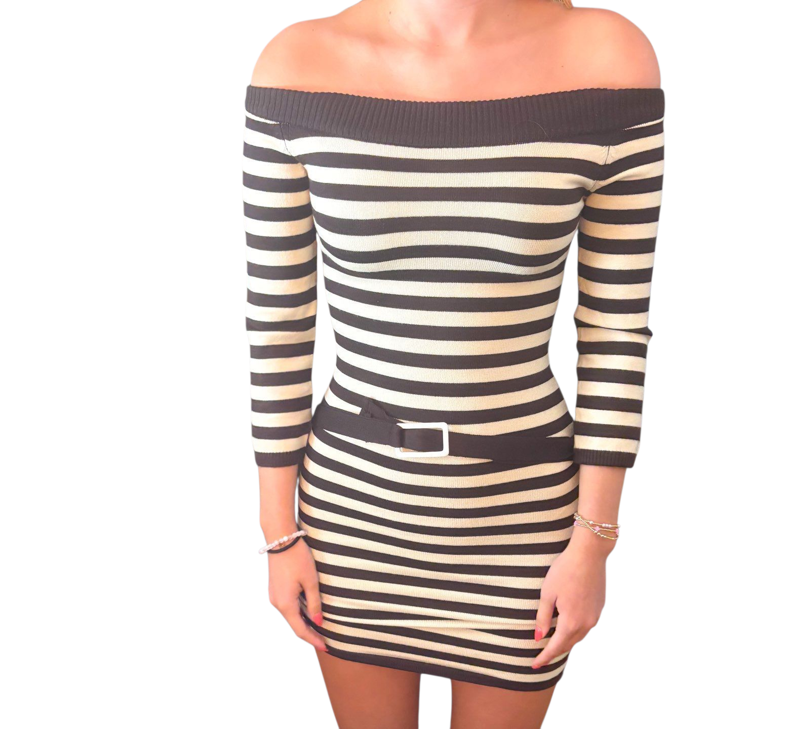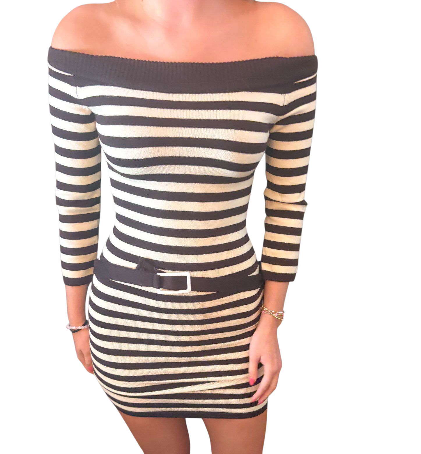 Brown and white striped bodycon mini dress with quarter sleeves. Can be worn off or on shoulder.