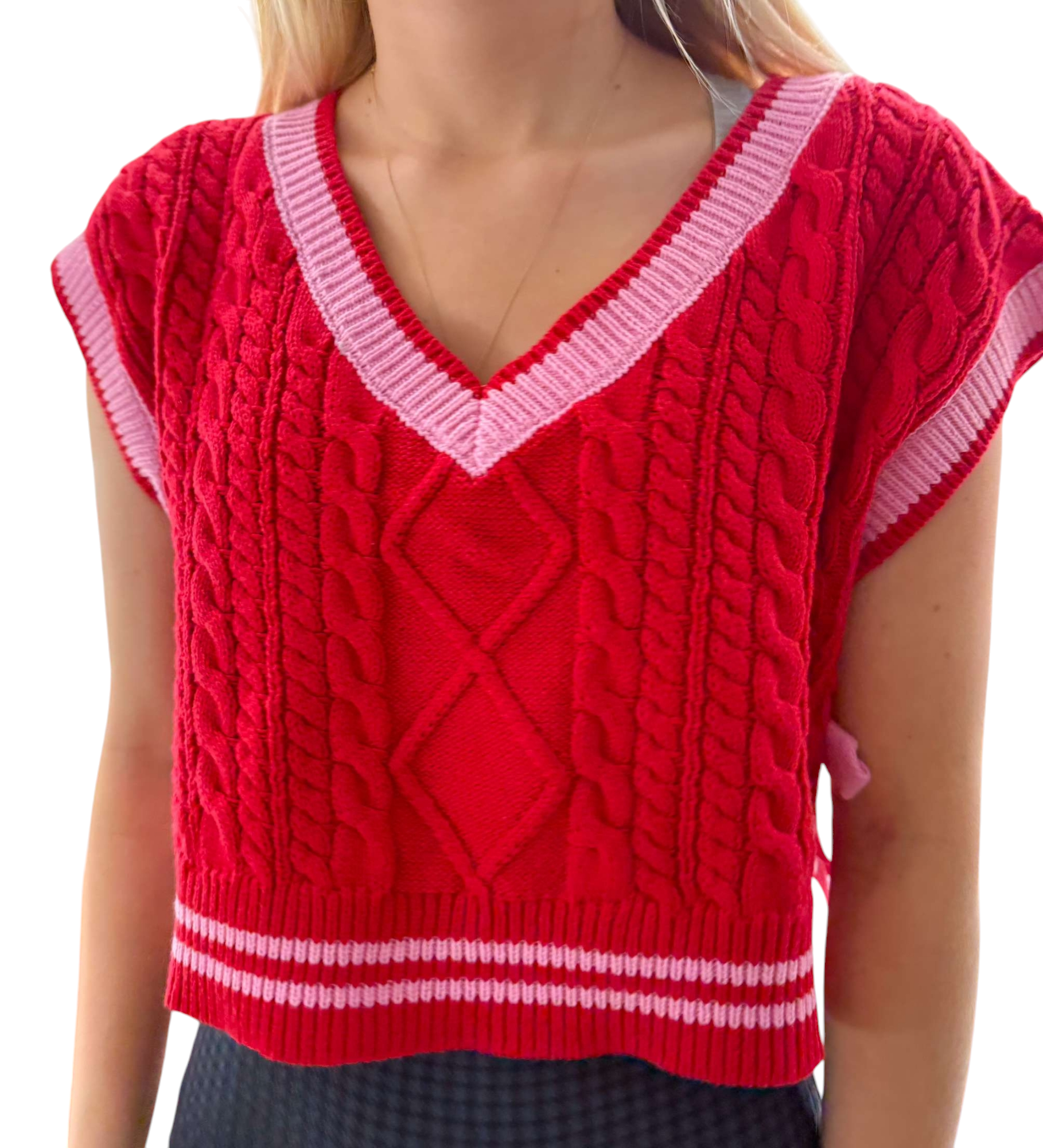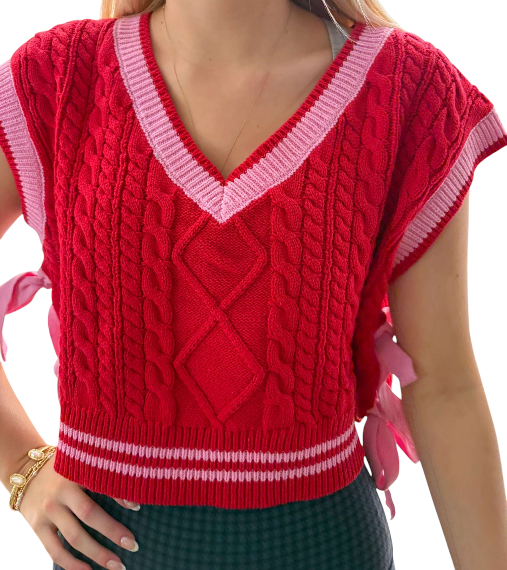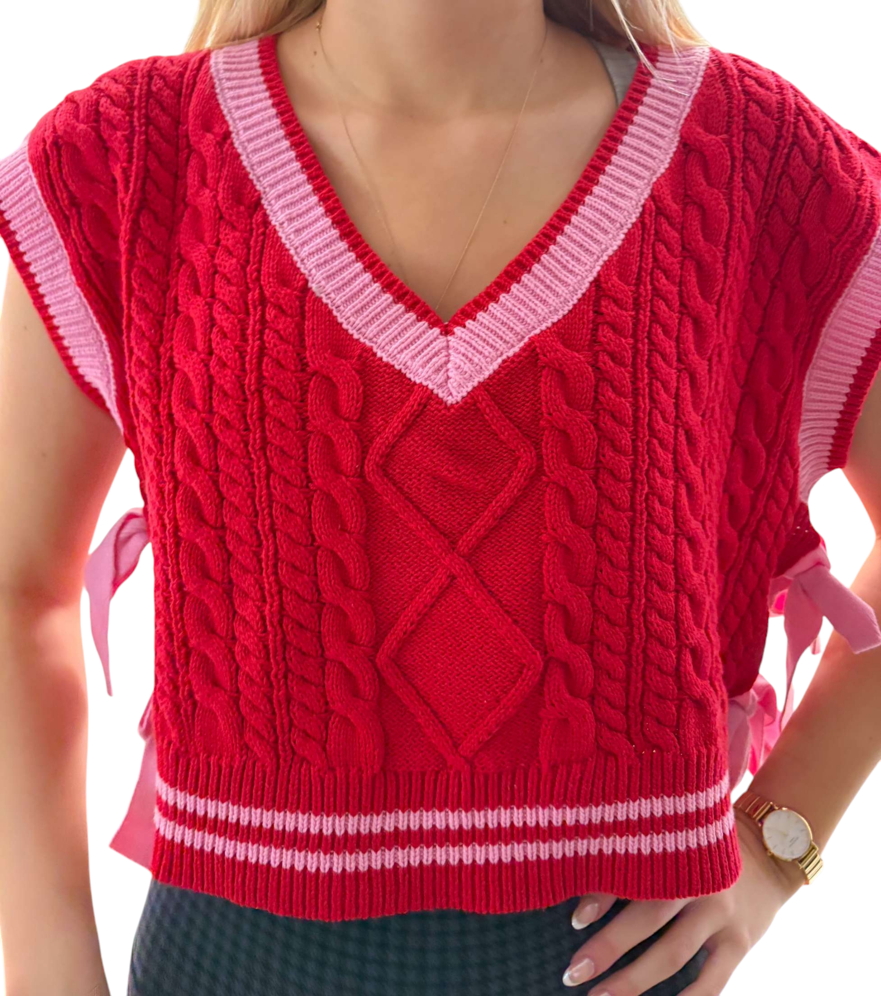 Red v neck sweater vest with striped and pink bows on side.