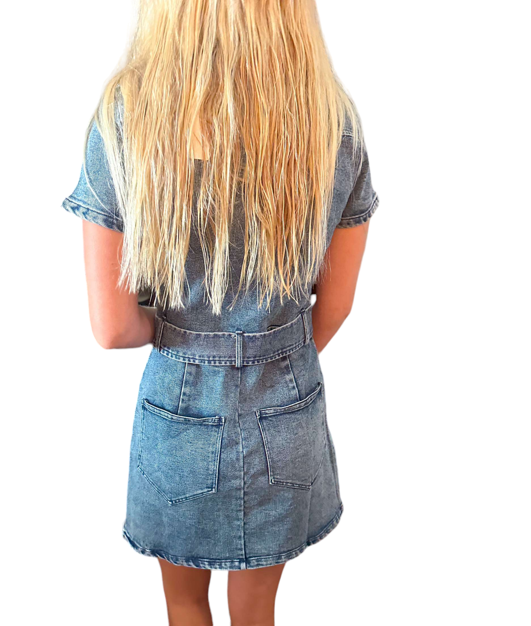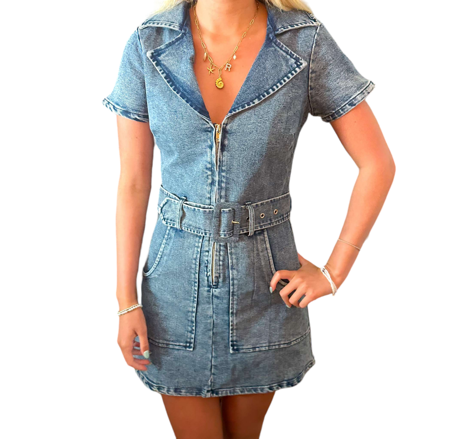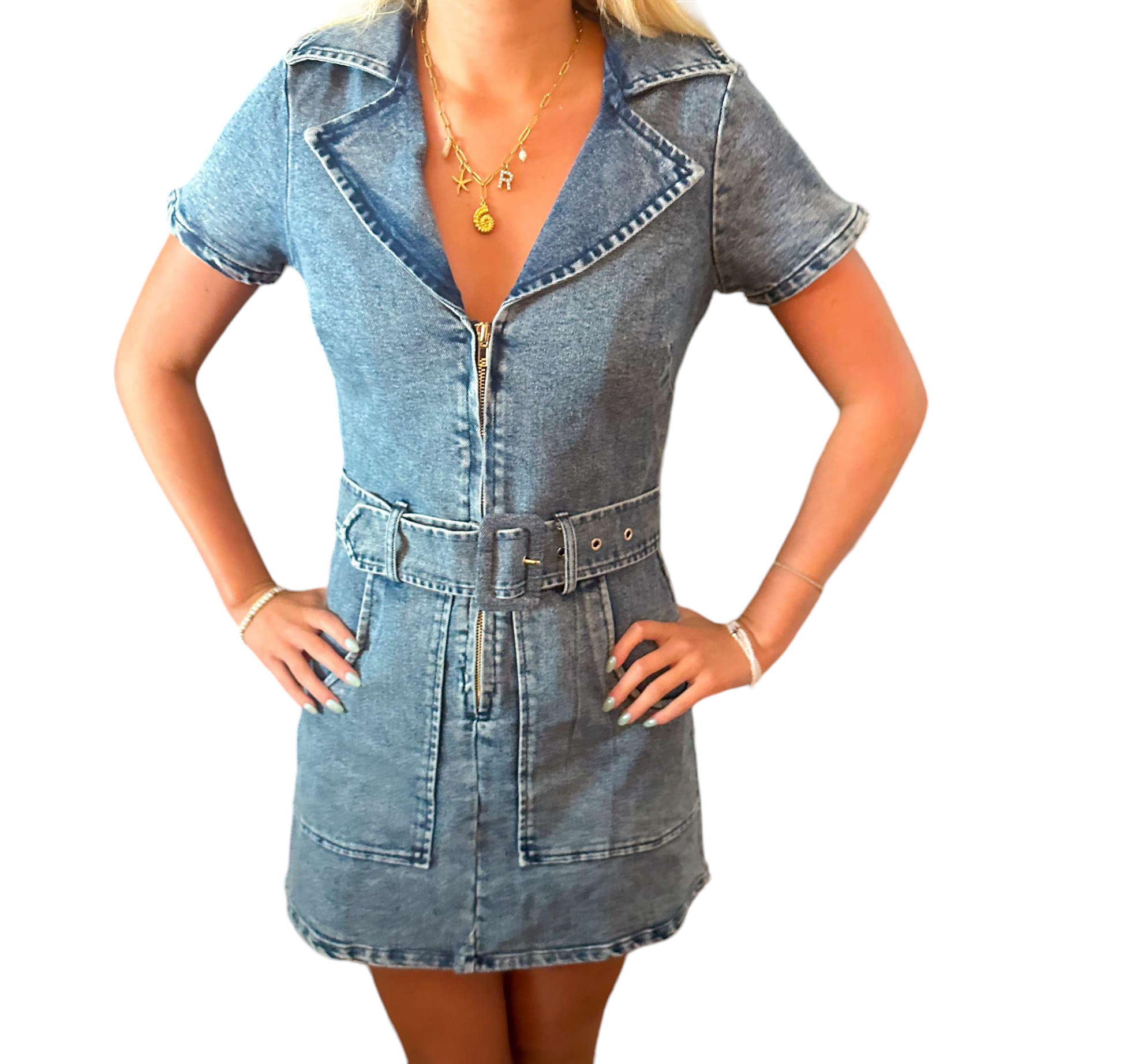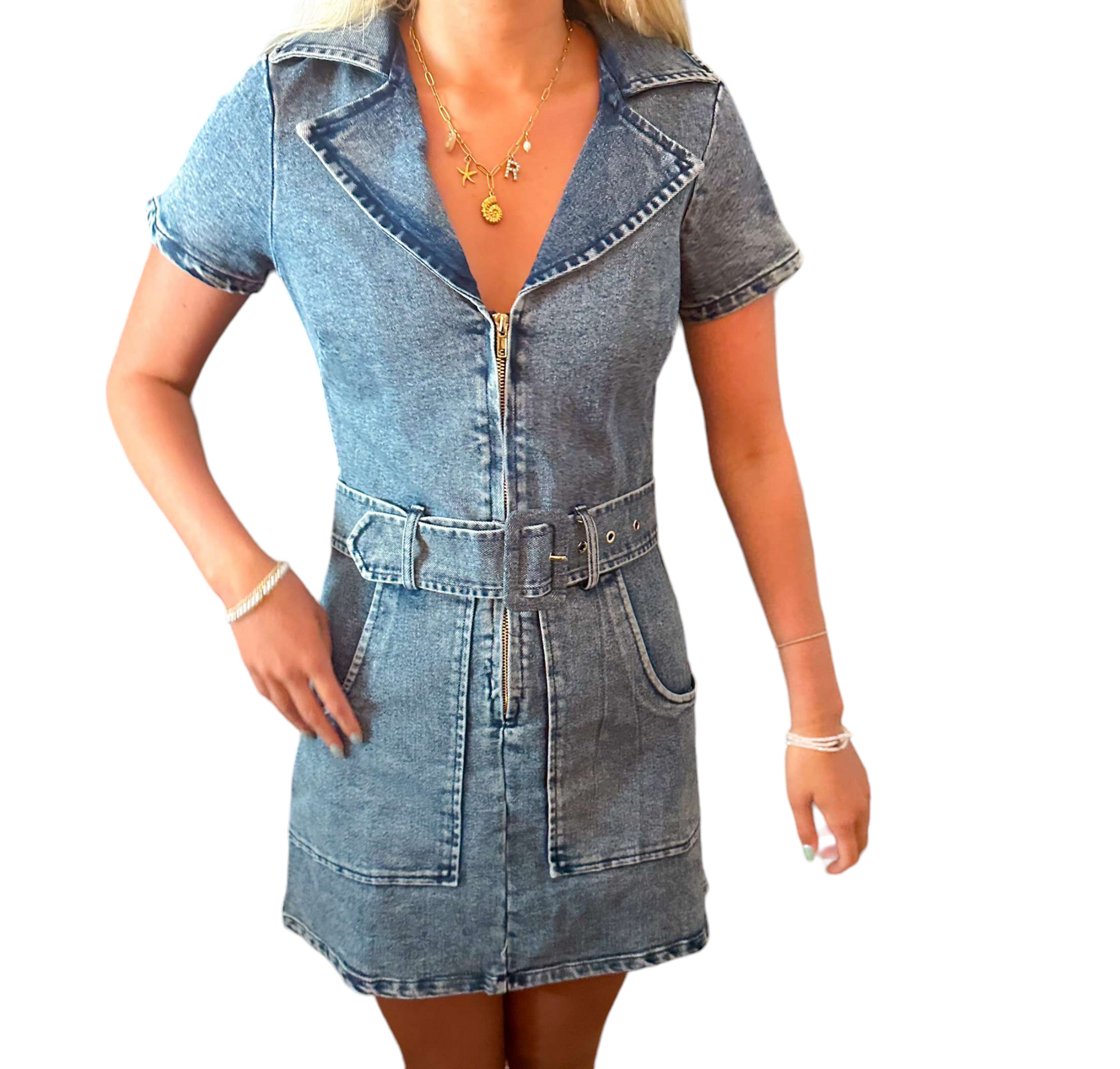 Introducing the Laney Denim Dress, your new go-to outfit for stand-out occasions. This stylish and versatile dress features a chic zipper front and a flattering belted design that accentuates your waist, making it perfect for any body type.
