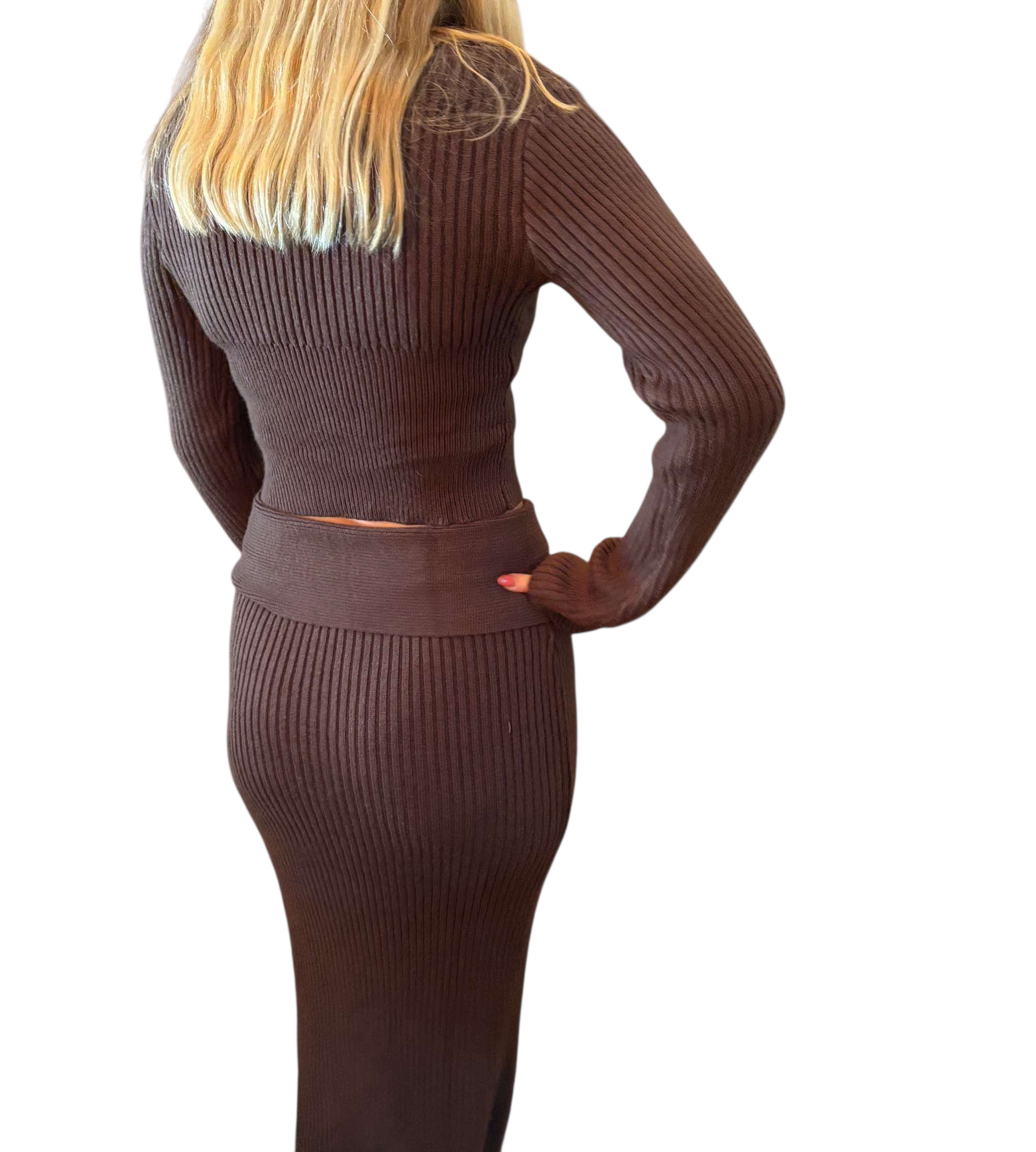Brown sweater maxi skirt with matching sweater top. Can be worn on or off shoulder.