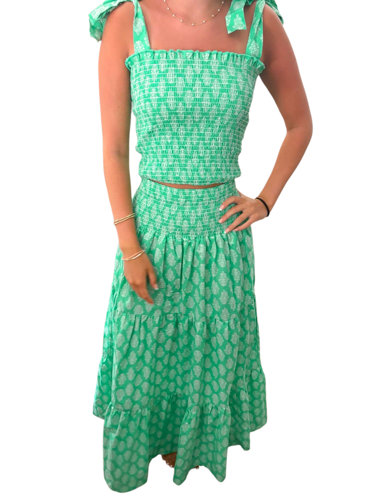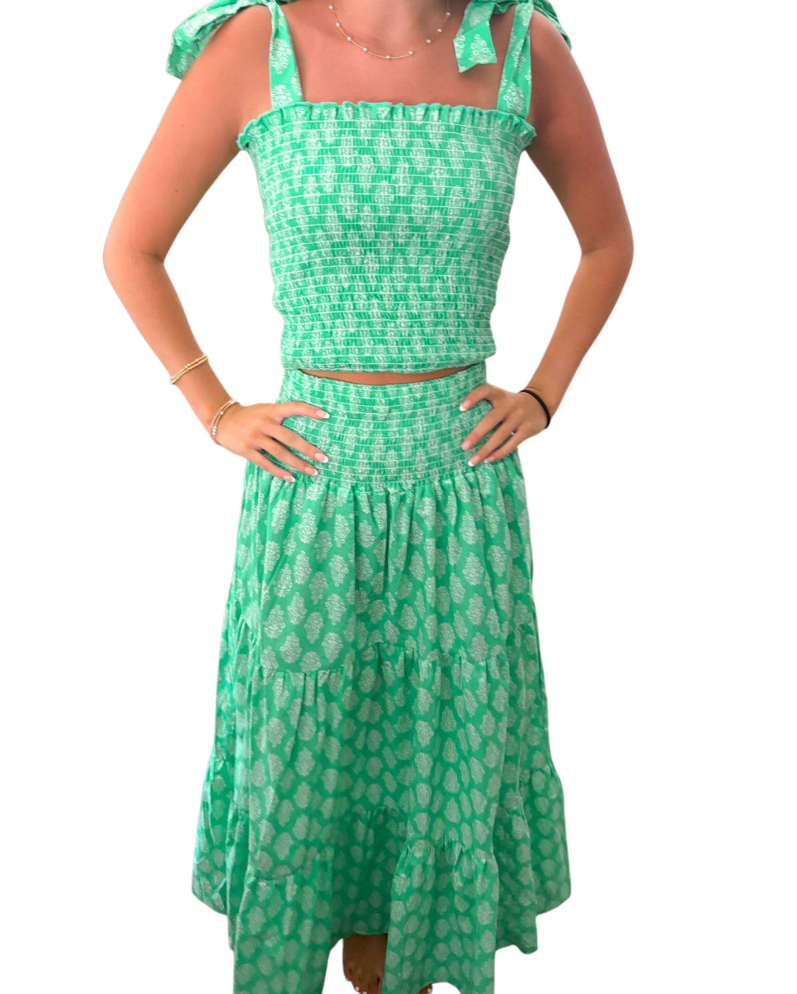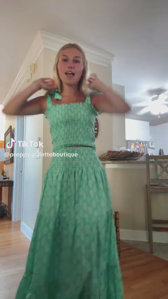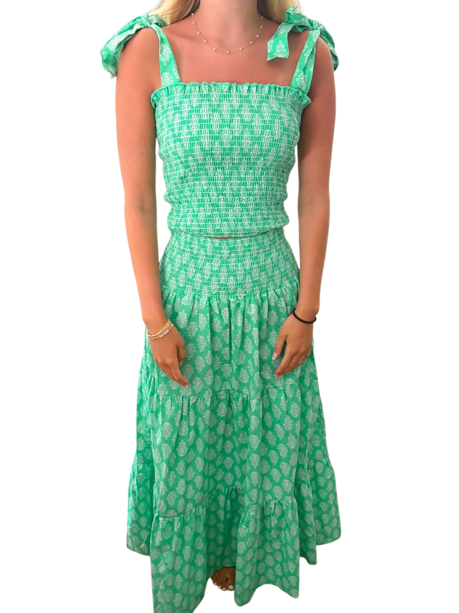 Introducing the Green Block Print Smocked Tie Top & Skirt Set – a timeless and elegant apparel set perfect for any lifestyle! Whether it’s brunching, dining, shopping, or carpooling, this beautiful, printed cotton dress is an essential wardrobe staple. The tie top straps give it a touch of romance while the smocking on both the top & skirt make it ultra-flattering. Wear as a set or separately, the possibilities are endless! Look no further for a fashion staple that will last you season after season!