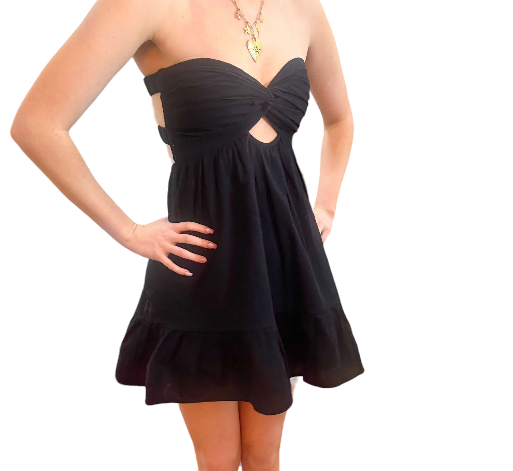 Step into elegance and allure with the Gwen Dress. This stunning black backless strapless dress is designed to make a statement, perfect for any occasion where you want to shine.