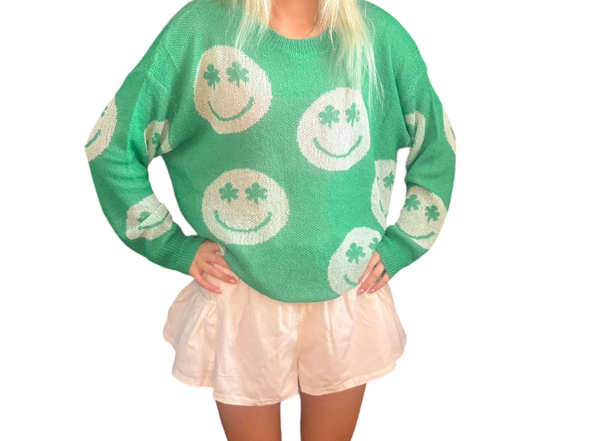 Shemrocks and smiles in green. Perfect for at Patrick's Day! Thin sweater so can be worn in warm or cool weather.