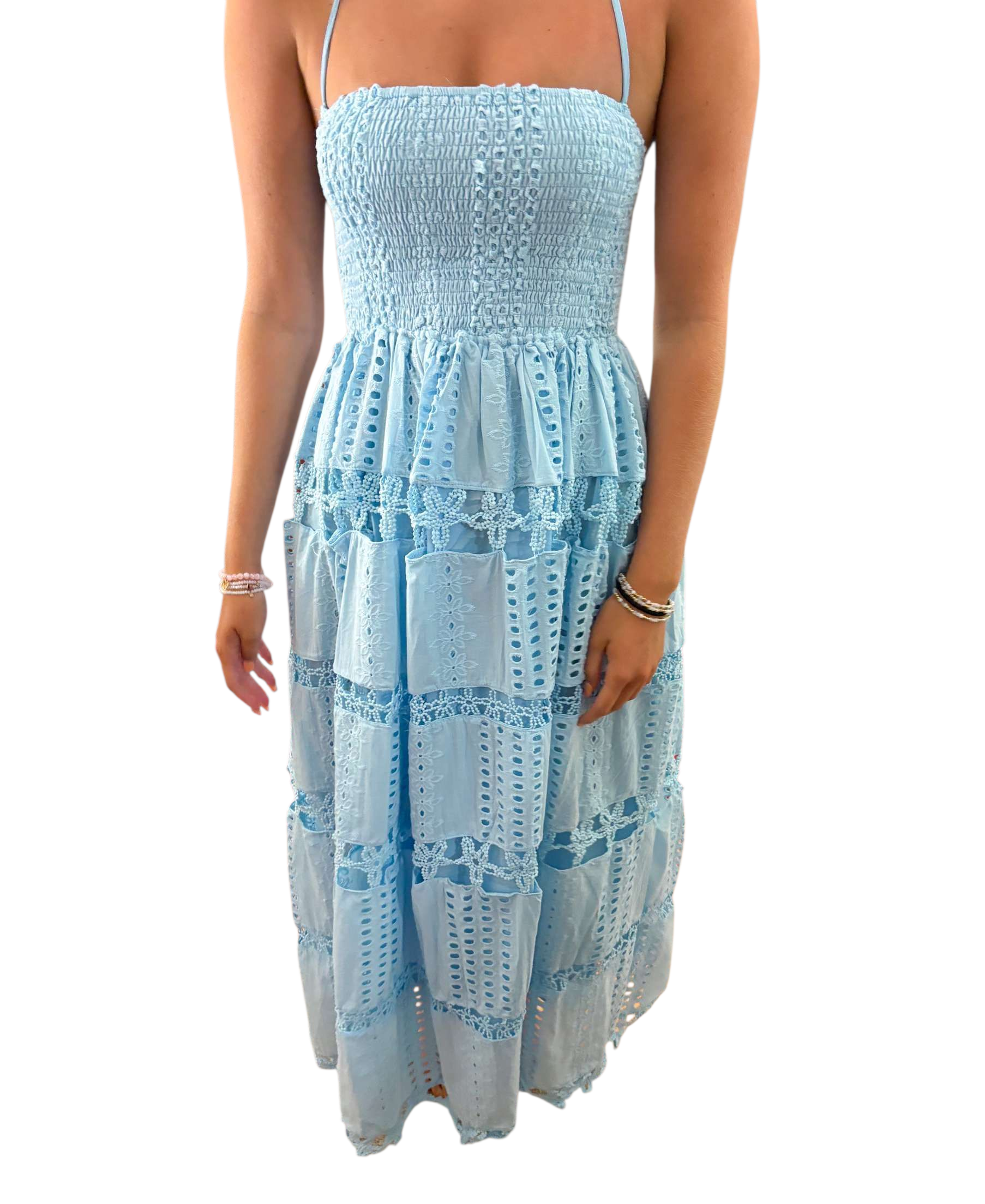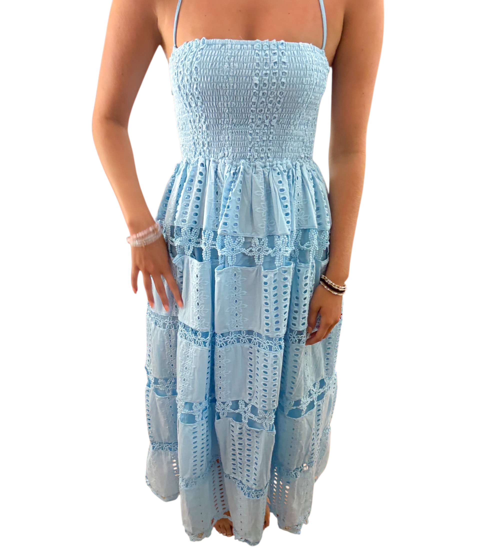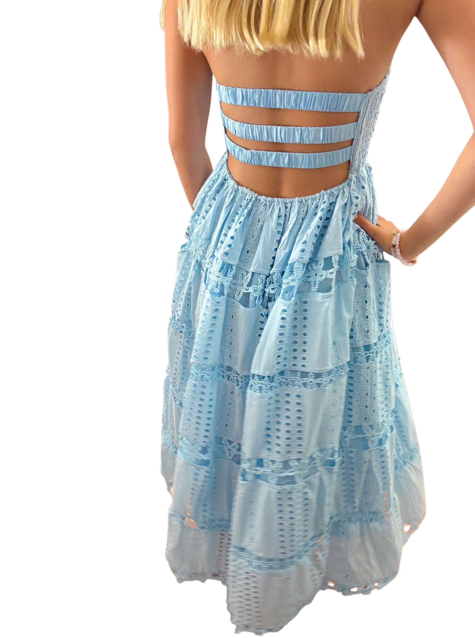 Blue strapless embroidered maxindress with open back and tie straps. Has slip underneath as well.
