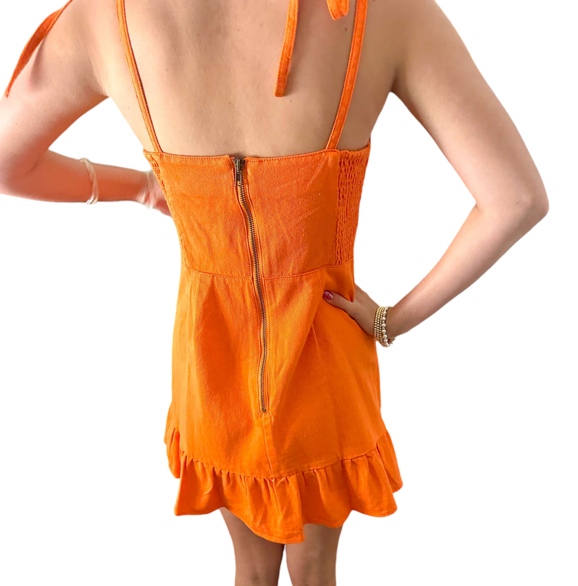Elevate your wardrobe with the stunning Sunkist Denim Dress, designed to make a statement wherever you go. This vibrant orange mini dress is crafted from high-quality denim, ensuring both style and comfort.