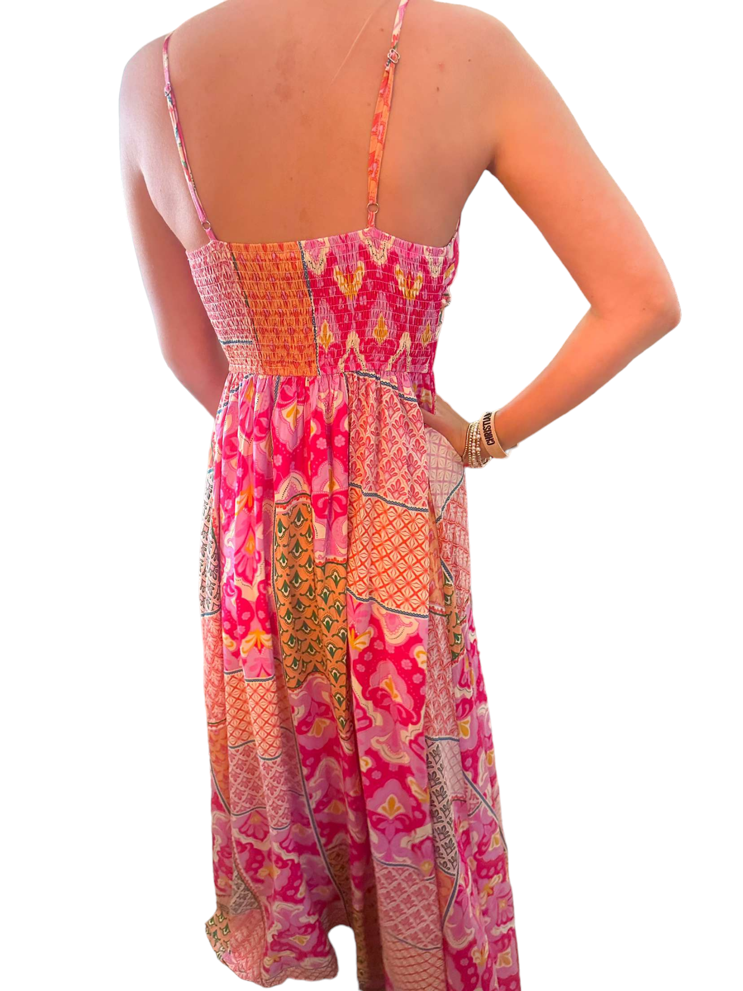 Step into a world of bohemian charm with the Thea Maxi Dress. This stunning garment combines a vibrant pink, peach, and fuchsia floral patched design, perfect for making a statement at any occasion.