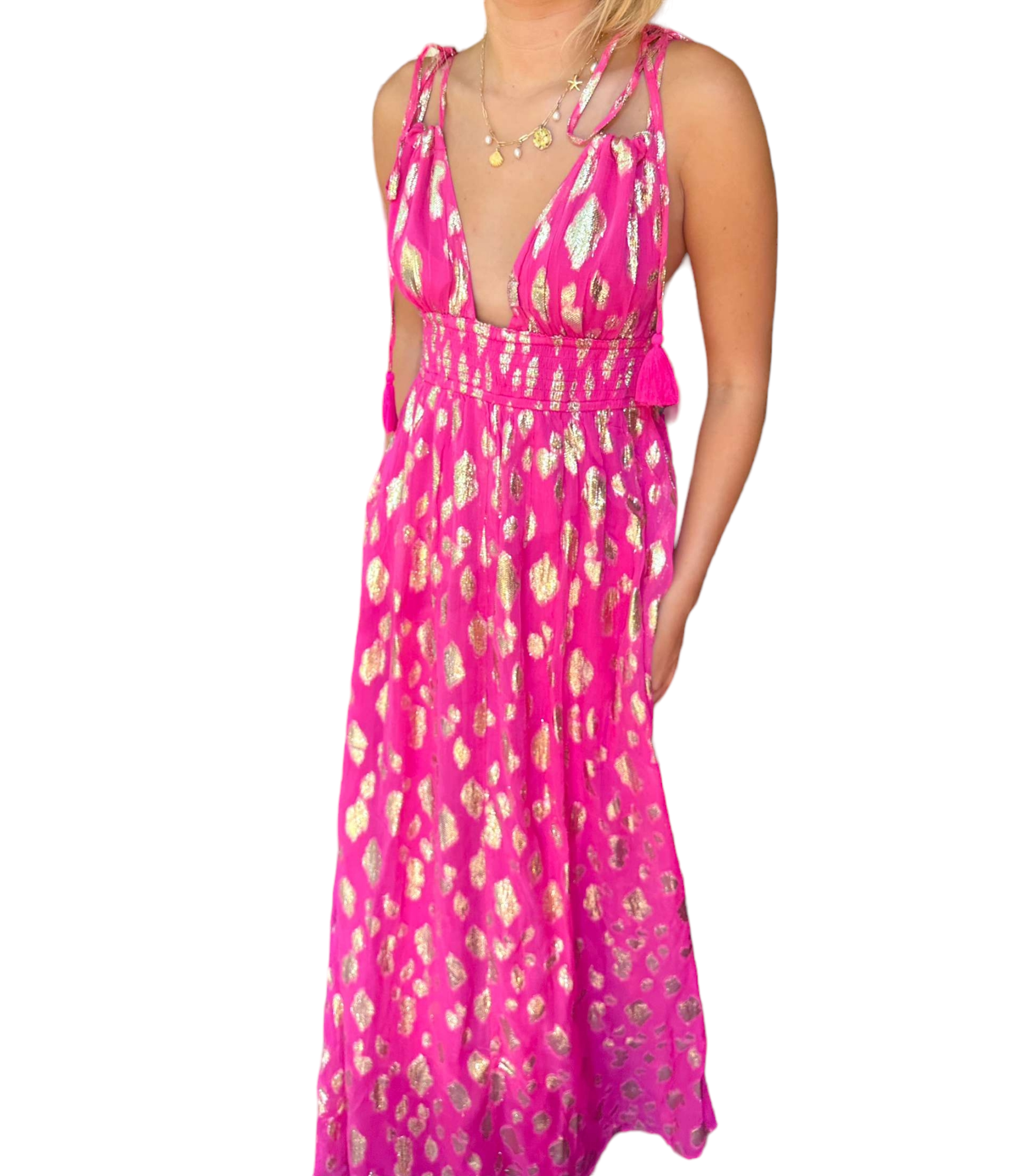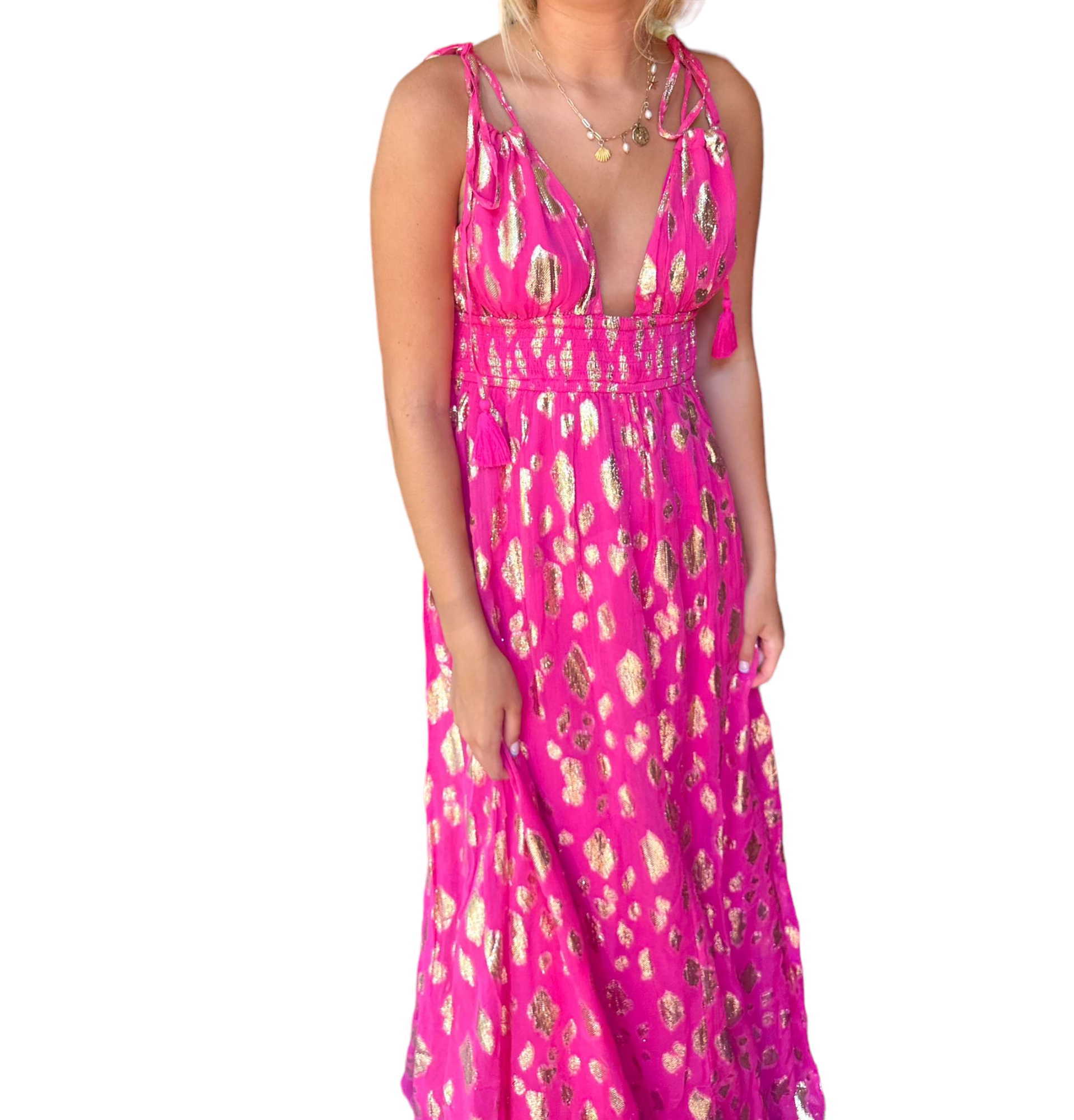 Step into style with the stunning Tabitha Dress, a perfect blend of sophistication and charm. Designed for the modern woman, this tie shoulder maxi dress features eye-catching lurex spots that add a touch of sparkle to any ensemble.