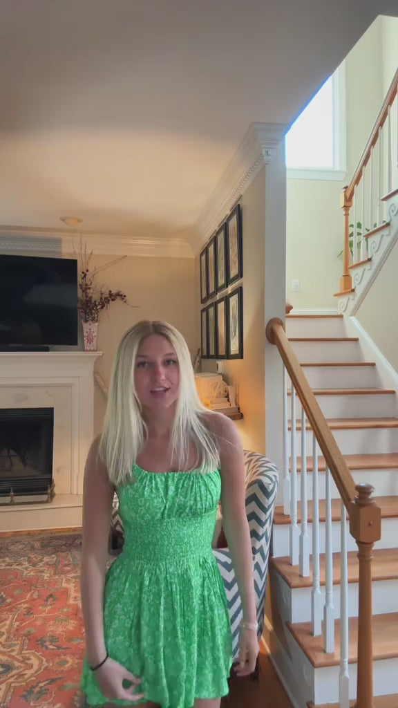 Green floral Halter smocked body mini romper with halter neck and adjustable tie straps.